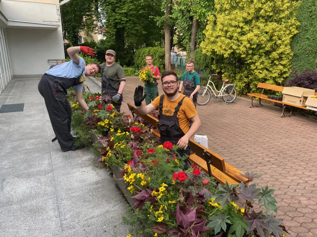 Ogrodnicy z klasy 3o wykonali przed szkołą nasadzenia z wiosennych kwiatów.