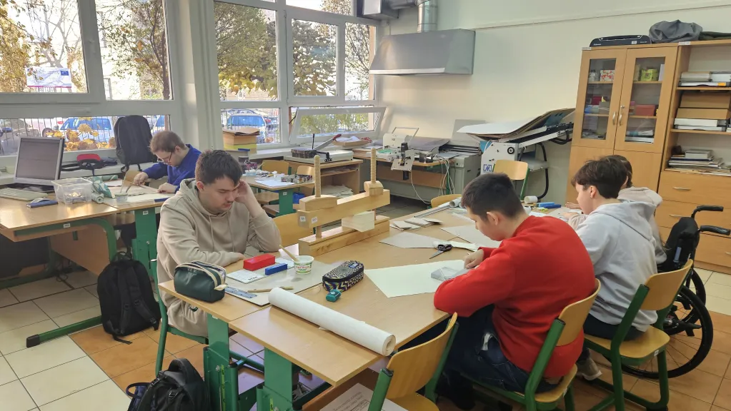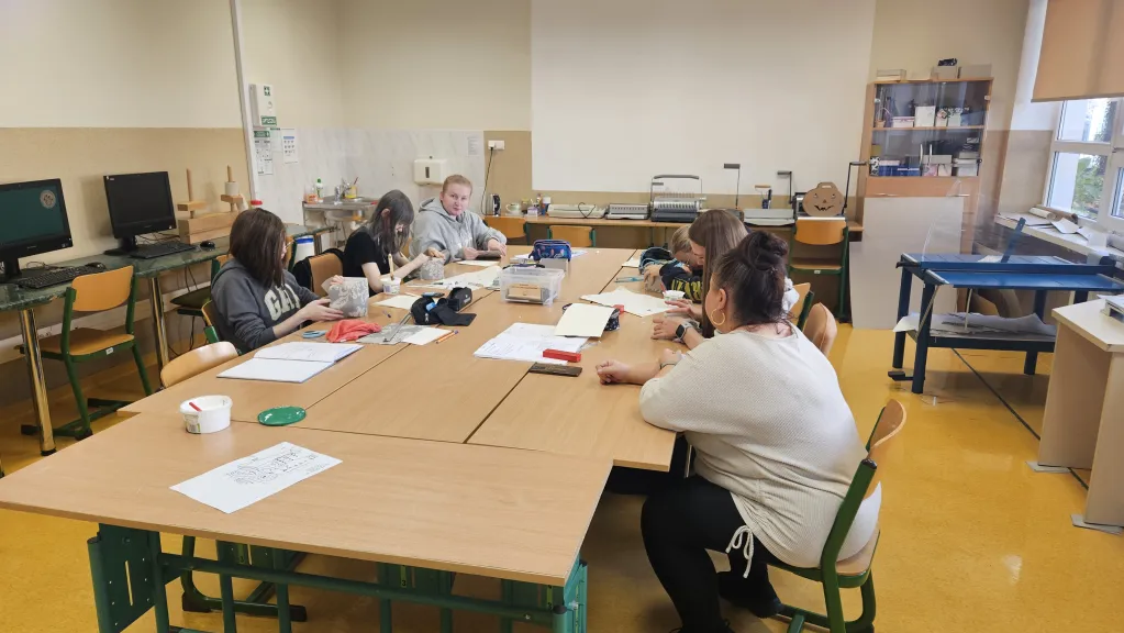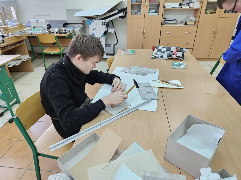 Zajęcia praktyczne odbywają się w szkolnej pracowni introligatorskiej, która wyposażona jest w nowoczesny sprzęt i urządzenia.