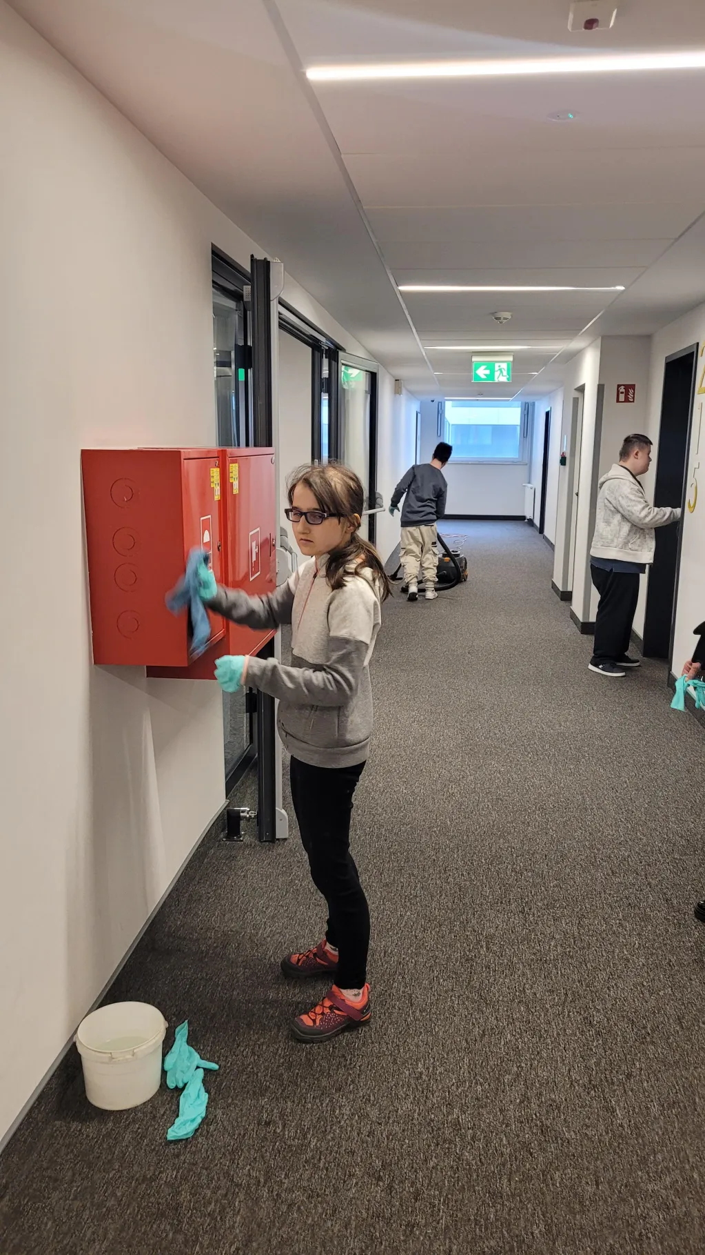 Klasa 2c w roku szkolnym 2023/24 realizuje praktyki w hotelu IBIS Ostrobramska. Podczas praktyk sprzątają pokoje, korytarze, klatki schodowe, wycierają kurze, odkurzają. Po ciężkiej pracy jedzą poczęstunek.